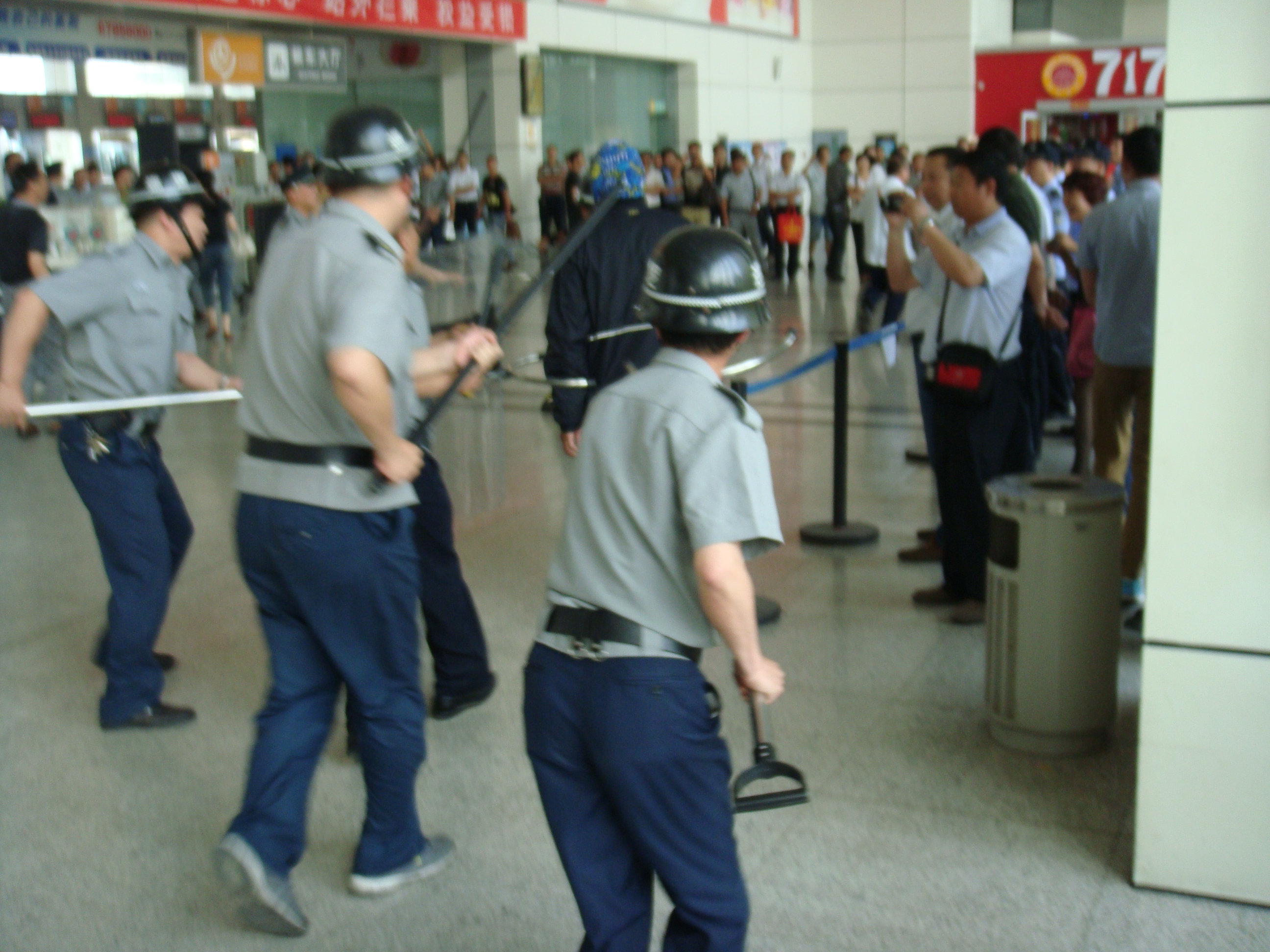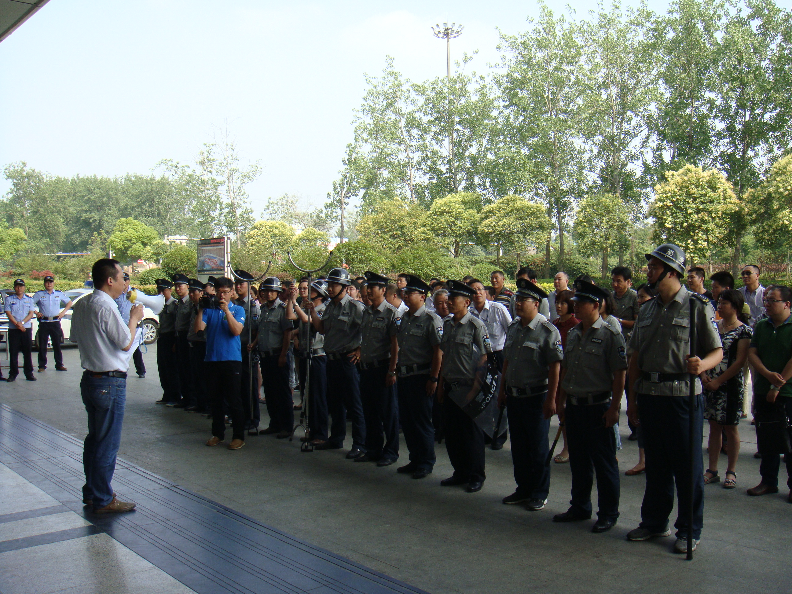 6月12日下午4點(diǎn)05分,演練模擬了揚(yáng)州汽車東站售票大廳里兩名手持砍刀的歹徒正往候車廳方向晃悠,值班保安發(fā)現(xiàn)這一險(xiǎn)情后,車站迅速啟動(dòng)應(yīng)急預(yù)案,車站保衛(wèi)人員協(xié)同車站一線職工緊急疏散乘客,使乘客有序、安全撤離現(xiàn)場(chǎng),隨即,6名防暴隊(duì)員手持鋼叉、齊眉棍、警棍,將兩名手拿砍刀的暴徒團(tuán)團(tuán)圍住,經(jīng)過(guò)短短幾分鐘的對(duì)持和搏斗,兩名歹徒終于被制服,并被隨后趕來(lái)的民警帶走……