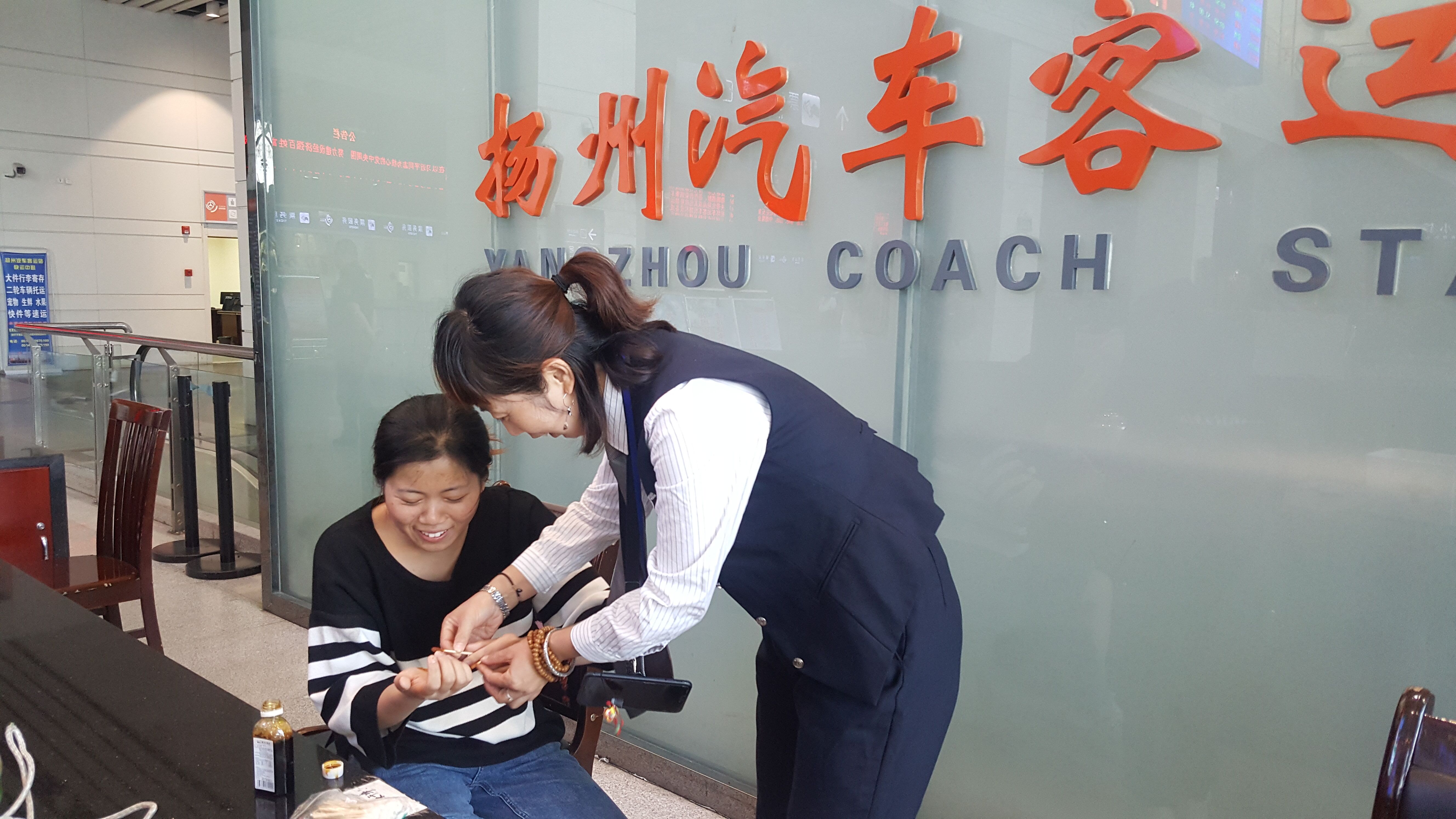 今天(10月11日)下午3時(shí)許,揚(yáng)州西部客運(yùn)樞紐售票大廳門(mén)口,一位年輕女子背著行李,一瘸一拐痛苦地邁進(jìn)了汽車站售票大廳,見(jiàn)此情形,眼尖心細(xì)的服務(wù)班工作人員殷俊,迅速跑上前去,攙扶著該女士坐下。