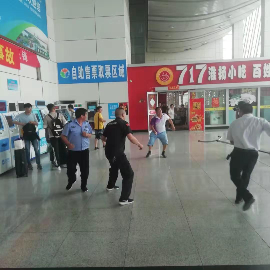 演練過程中,售票廳一名“恐怖分子”突然拿出一把堅刀,揮刀砍向進(jìn)站的旅客及周邊群眾,車站工作人員發(fā)現(xiàn)后,立即將情況上報反恐防暴應(yīng)急領(lǐng)導(dǎo)小組、拉響站內(nèi)報警鈴、疏導(dǎo)旅客撤離至安全區(qū)域、關(guān)閉大門,并撥打“110”電話報警,同時反恐救援組人員使用手持盾牌、防暴鋼叉與歹徒周旋,進(jìn)行前期防控,牽制“恐怖分子”至公安趕赴現(xiàn)場,最終成功制服“歹徒”,“事件”得到了及時有效的處置。