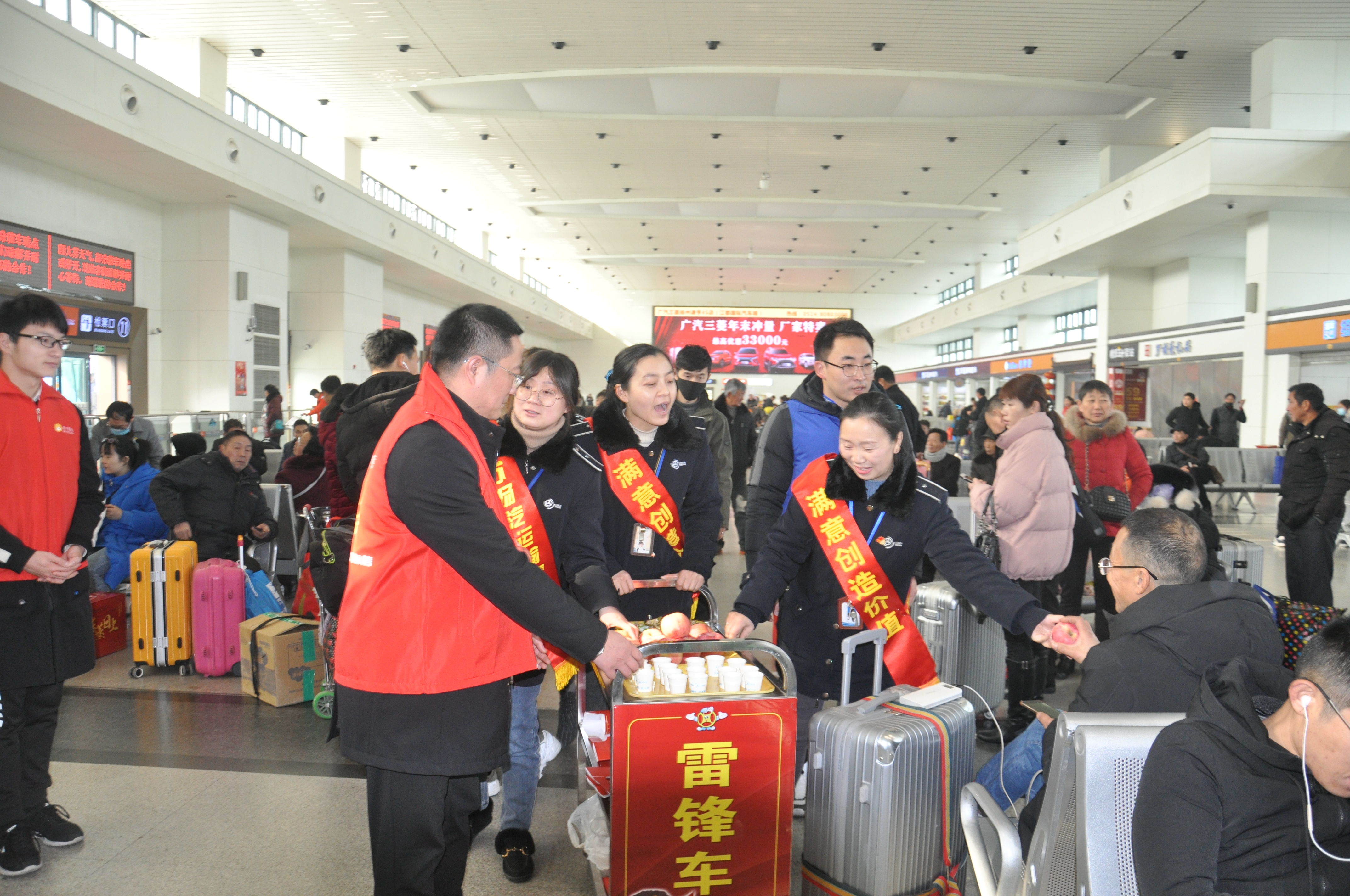 在揚(yáng)州汽車站的候車大廳里,我們揚(yáng)汽的志愿者們也在忙碌著,為歸鄉(xiāng)的務(wù)工人員送上了熱飲和湯圓送到讓旅客們?cè)诤锔惺苤业臏嘏。歸鄉(xiāng)的務(wù)工人員背著行囊,手中拿著福袋,在揚(yáng)汽志愿者的幫助下順利到達(dá)了檢票口并登上了回家的大巴。“情滿旅途、溫馨相伴”,我們揚(yáng)汽的每一位職工將一直守護(hù)著民工朋友的歸途。