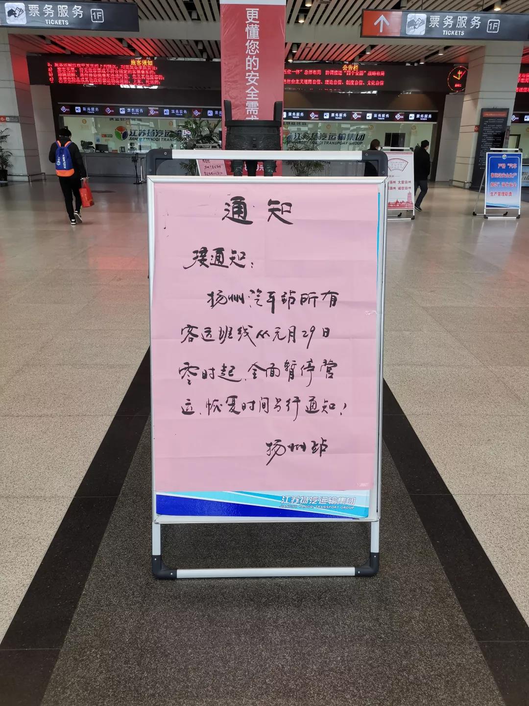 為進(jìn)一步配合我市做好新型冠狀病毒感染的肺炎疫情防控工作,遏制疫情通過交通渠道擴(kuò)散傳播,揚(yáng)汽集團(tuán)根據(jù)揚(yáng)州疫情防控工作需要,決定從2020年1月29日0時(shí)起,暫停揚(yáng)州汽車站、揚(yáng)州汽車東站及江都汽車客運(yùn)站的運(yùn)營(yíng),停發(fā)所有客車班線,暫停所有包車客運(yùn)業(yè)務(wù)。