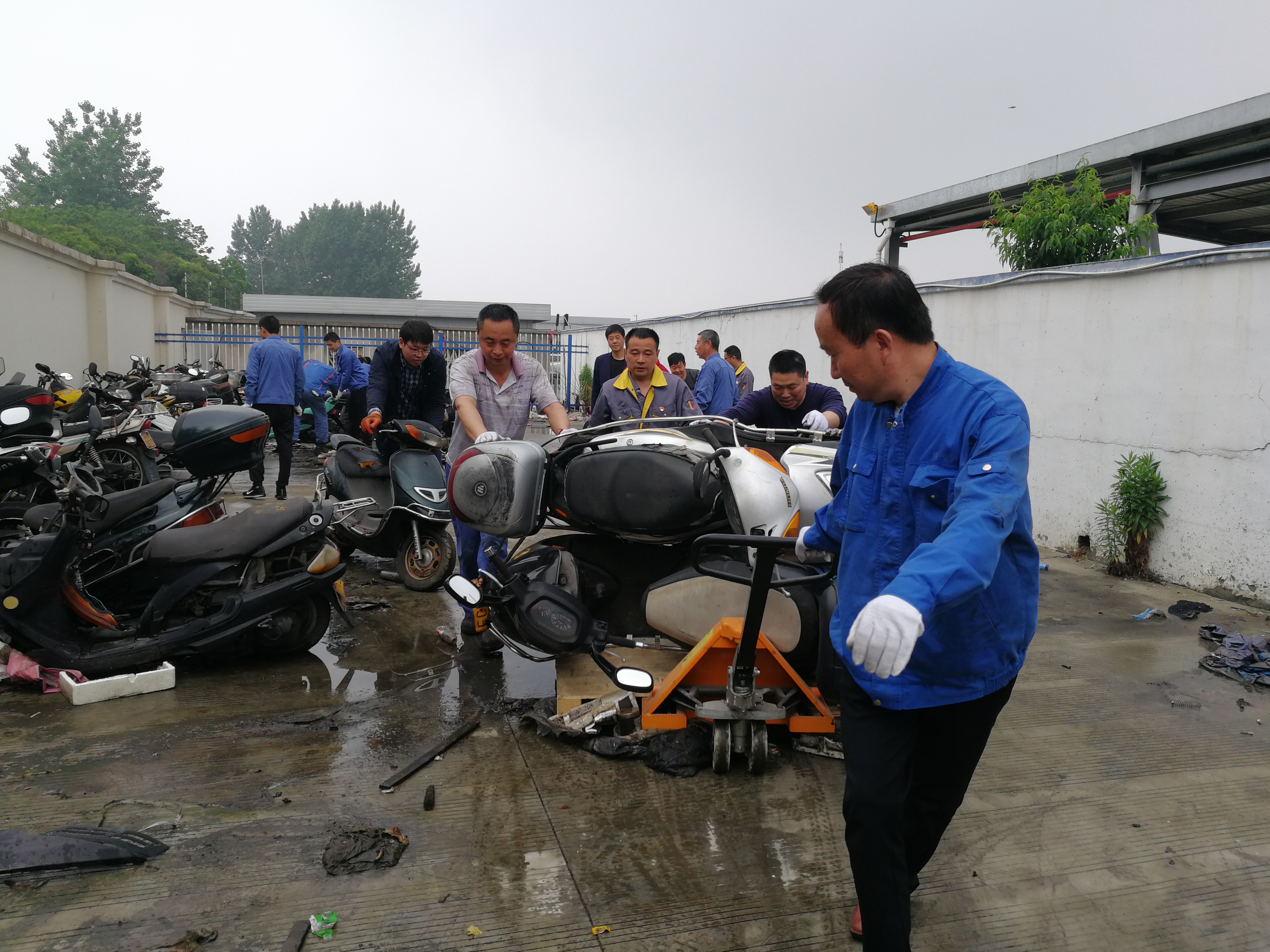 8時15分搬運工作正式開始,針對輪軸銹蝕、車輪變形、車輪遺失、車輪鎖死等不同情況的扣押車輛,大家使用車輪托架、電動三輪、托盤叉車等輔助搬運工具,共同協(xié)作,聽從指揮,一步一步移至指定區(qū)域。經過兩個半小時的高效協(xié)作,大家克服場地臟亂和天氣的悶熱,將靠近天燃氣加氣站一側的車輛全部清理完畢,扣押場地車輛在指定停放區(qū)域擺放整齊,消除了安全隱患。