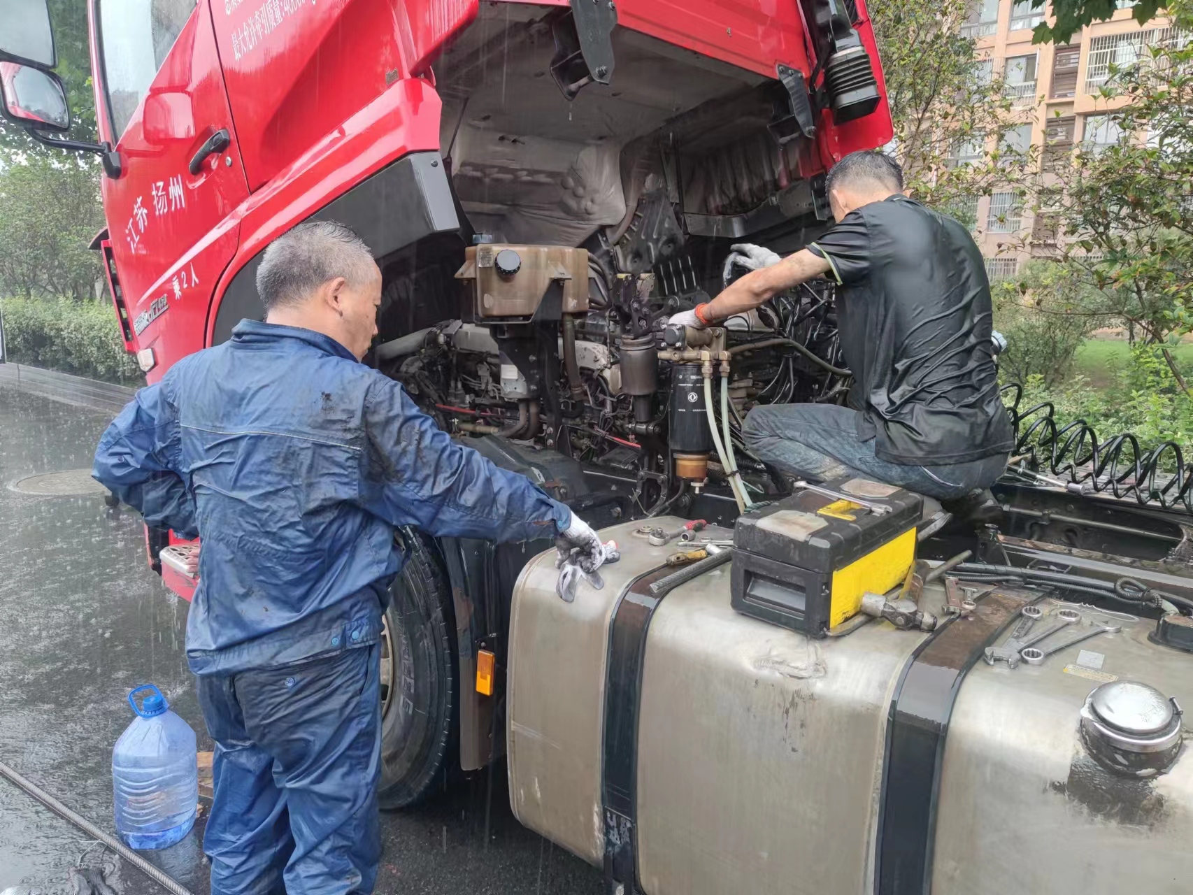 修理工們到達南京后立馬分工合作,由于在路邊救援多有不便,加上天氣變化惡劣,為了保證貨車能及時趕往工地,救援人員不畏艱險、不懼風雨堅持搶修。即使衣服已經(jīng)全部濕透,油泥已經(jīng)掛滿全身,但大家毫無半點怨言,專心投入在搶修任務(wù)中。直到順利換好變速箱三件套,車輛可以正常行駛。貨車公司的負責人在得知貨車安全上路后,也被大家這種不畏艱險的精神所感動,當場表示要與修理廠簽訂12輛半掛貨車的定保合同,同時他還激動的說到:“只有把車輛交給你們這樣認真負責,肯為車主著想的修理廠,才能放心!”