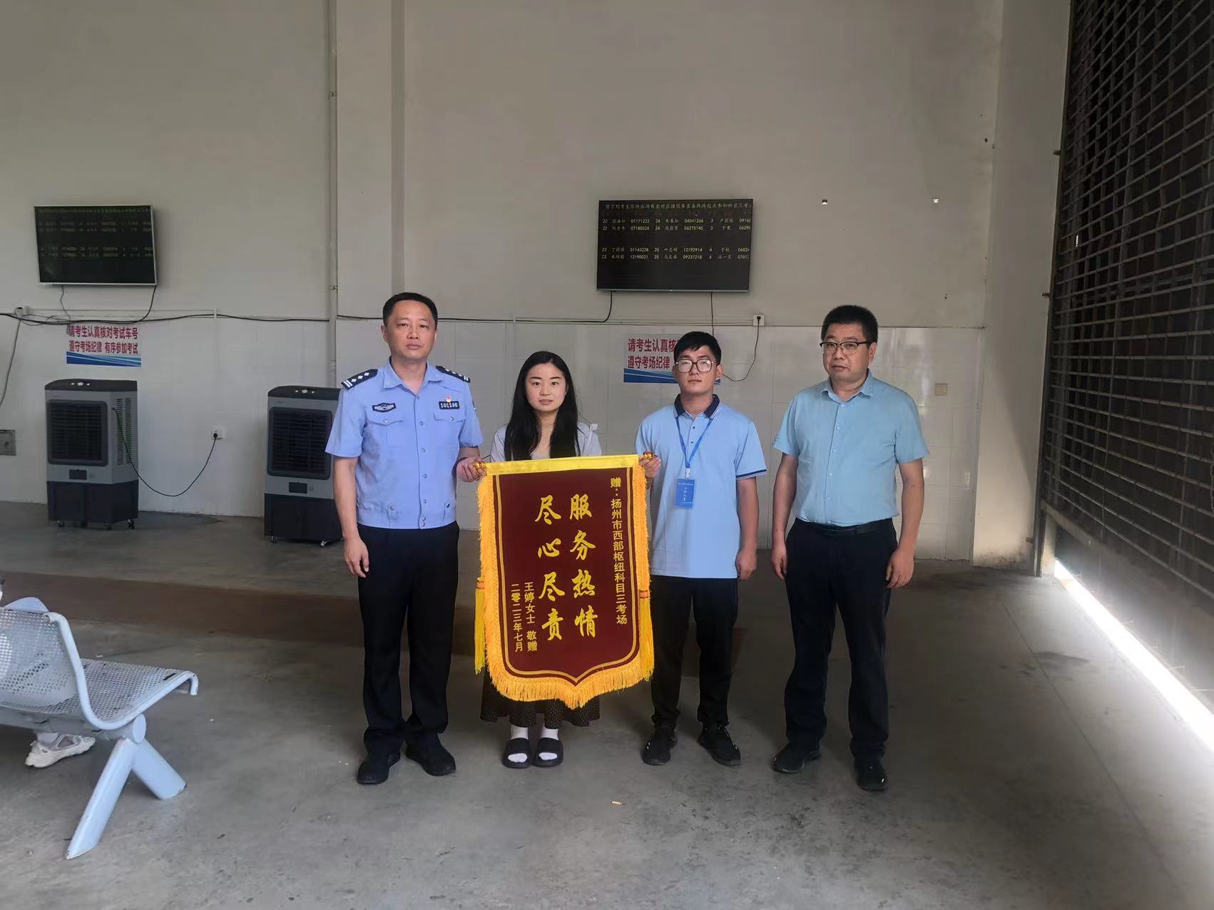 7月27日,揚(yáng)州西部客運(yùn)樞紐科目三考場(chǎng)收到了一面錦旗,印有“熱情服務(wù),盡心盡責(zé)”,王婷女士將錦旗交至車管所監(jiān)管人員和考場(chǎng)負(fù)責(zé)人手中,對(duì)現(xiàn)場(chǎng)工作人員的幫助表示感謝。