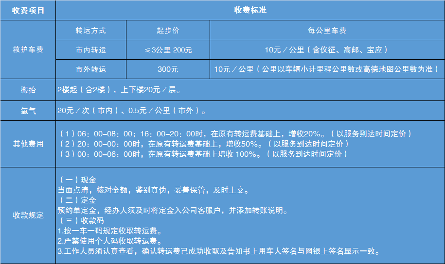 綜合衡量患者病情、轉(zhuǎn)運(yùn)距離、設(shè)備和人員配備等因素,目前非院前急救收費(fèi)標(biāo)準(zhǔn)如下: